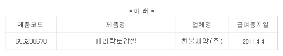 대해 2011.4.4일자로 품목허가취소 처분을 내려, 아래와 같이 2011.4.4일자로 급여중지 조치함을